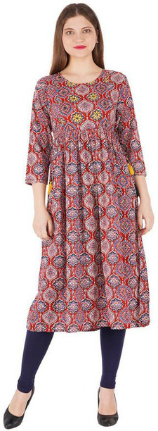 Women Printed Cotton Rayon Ethnic Dress With Attached D...