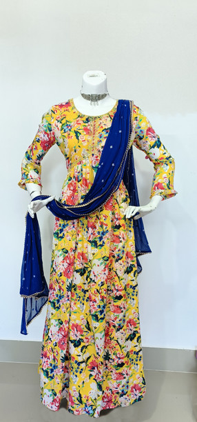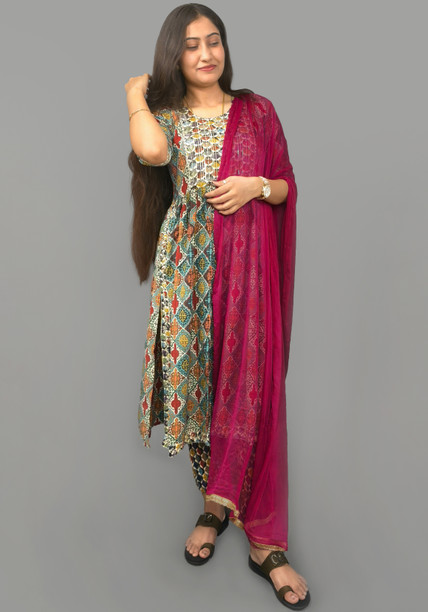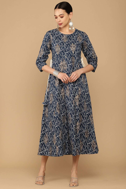 Women Printed Cotton Blend Ethnic Dress With Attached D...