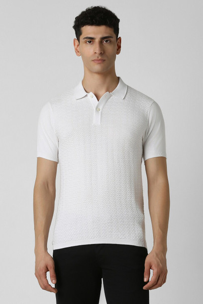 Men Self Design Polo Neck Cotton Blend White T-Shirt